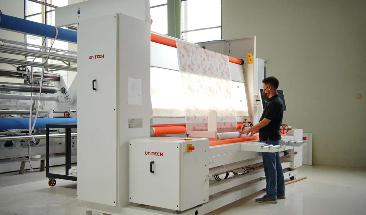 Kami juga memiliki mesin inspeksi kain dari Unitech. Mesin ini berfungsi untuk memeriksa dan meminimalisir cacat dan reject pada tahap akhir produksi. Mesin ini juga berfungsi untuk meningkatkan akurasi penghitungan jumlah produk dan menghemat waktu pada tahap Quality Control.